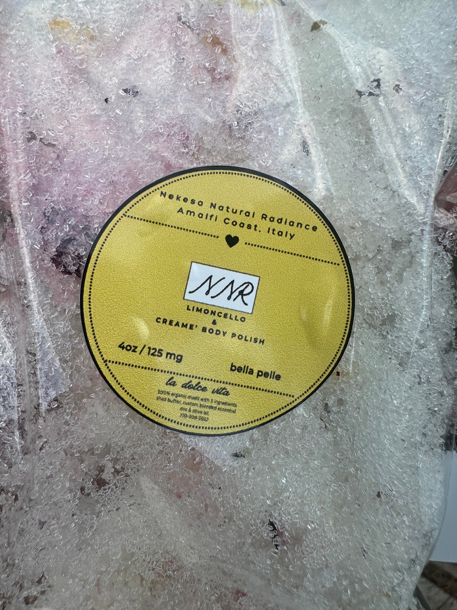 Massage a generous scoop onto damp skin in gentle, circular motions. Focus on dry areas like elbows, knees, and heels. Rinse thoroughly and follow with our Lemoncello Body Butter for all-day hydration and a layered scent.